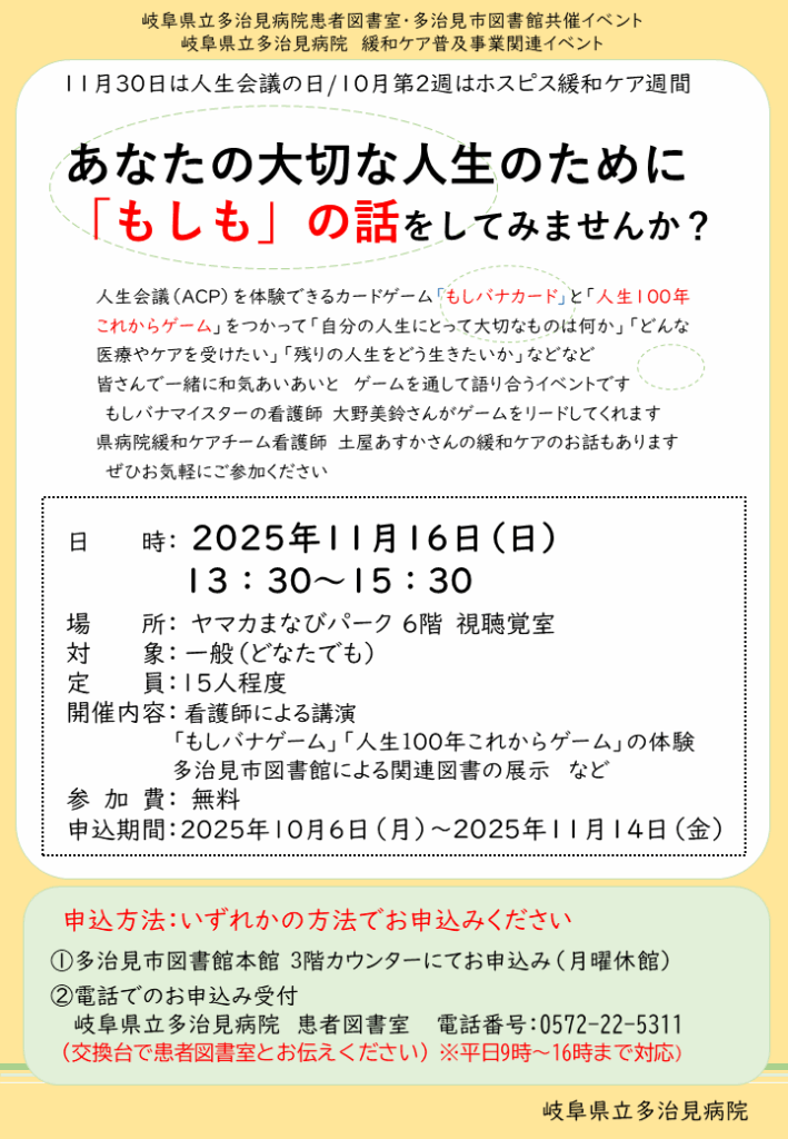 このたび、患者図書室と多治見市図書館による連携イベントを「まなびパーク」で開催します。11月30日は「人生会議の日」であることから、人生会議(ACP)の実践として、カードゲーム「もしバナカード」と「人生100年これからゲーム」を使い、「自分の人生にとって大切なものは何か」などについて、皆さんで一緒にゲームを通して語り合います。ぜひご参加ください。